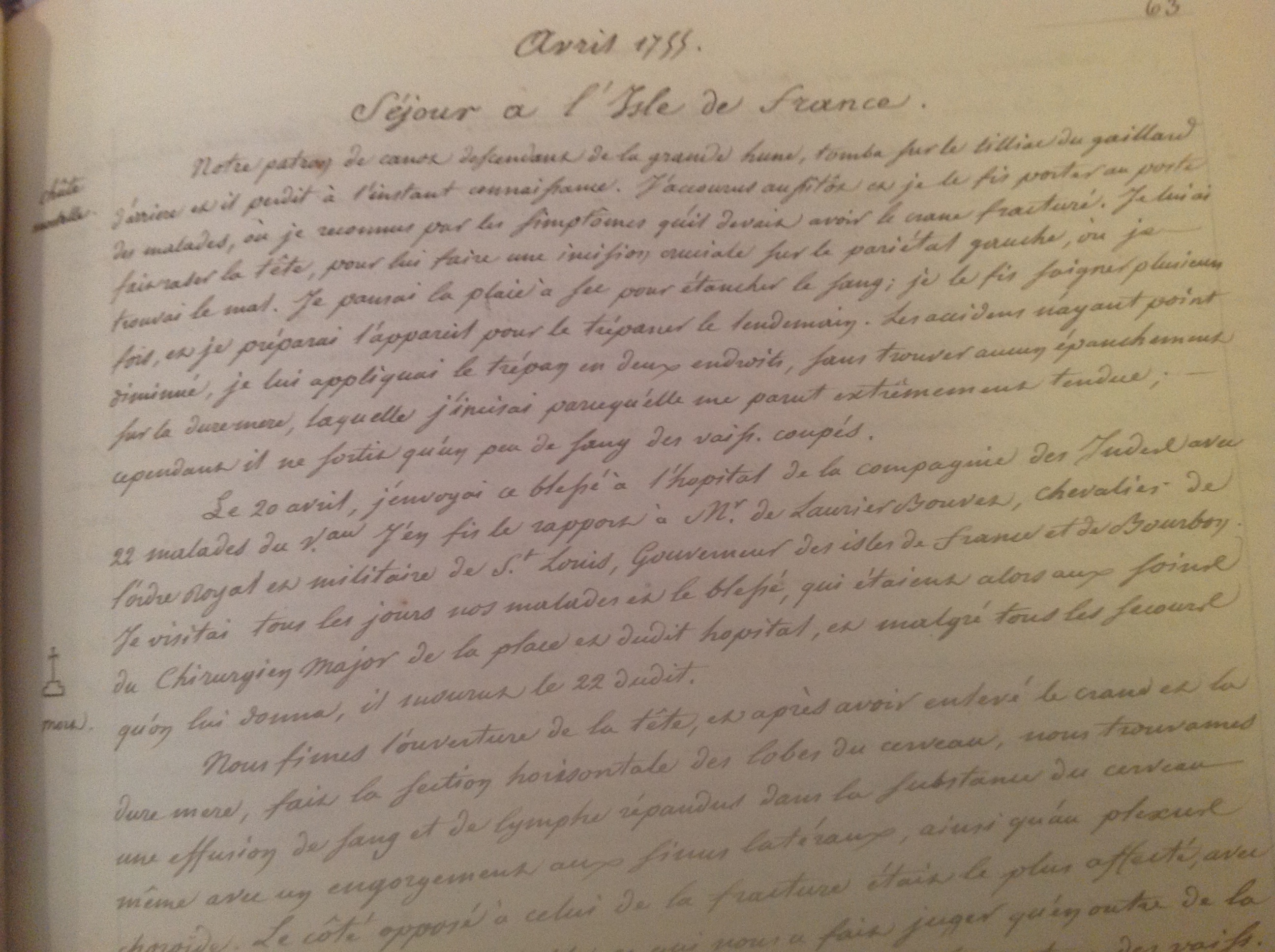 A2- Photo d’une page des carnets de notre ancêtre « Bernard de Chine » ; l’extrait présenté concerne « avril 1755, séjour à l’île de France… » ; une copie manuscrite des originaux de ces carnets sont toujours en possession de la descendance de Germaine MOLLET
